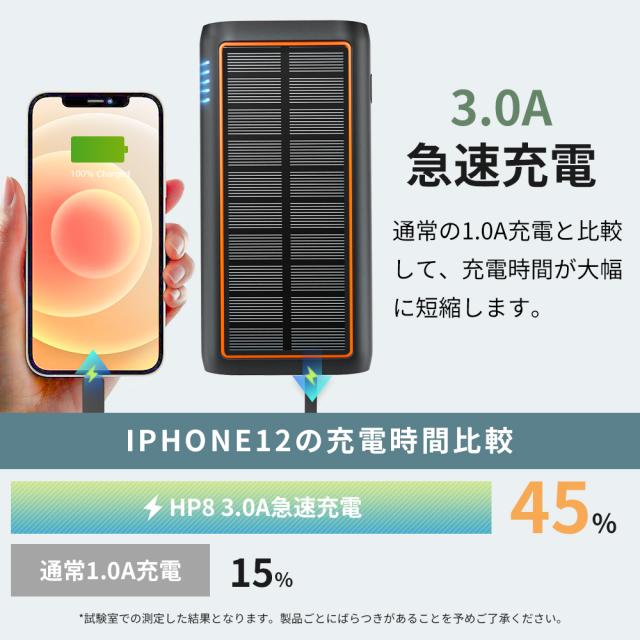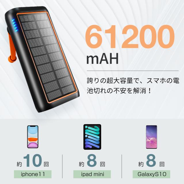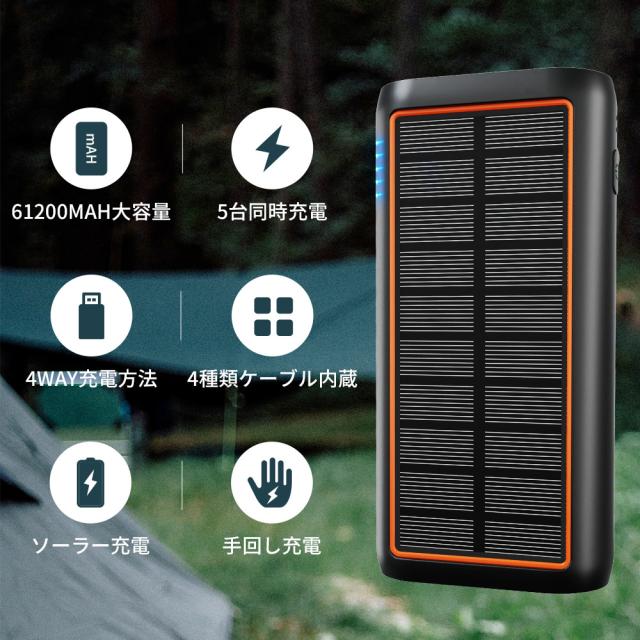 ソーラーモバイルバッテリー HP8 61200mAh 超大容量 3.0A急速充電 5台同時充電可能 ケーブル内蔵 ソーラーチャージャー 手回し 4WAY蓄電可能 LEDライト付き