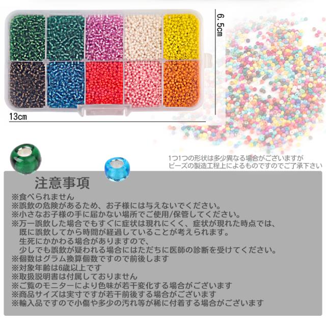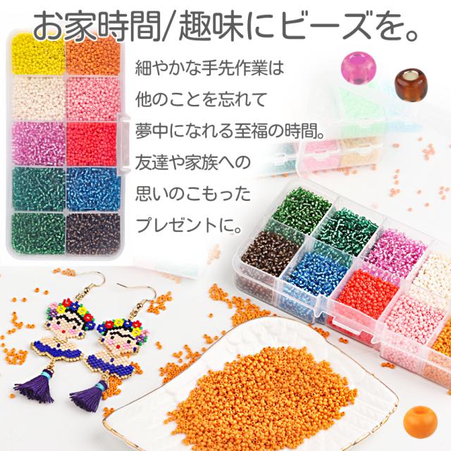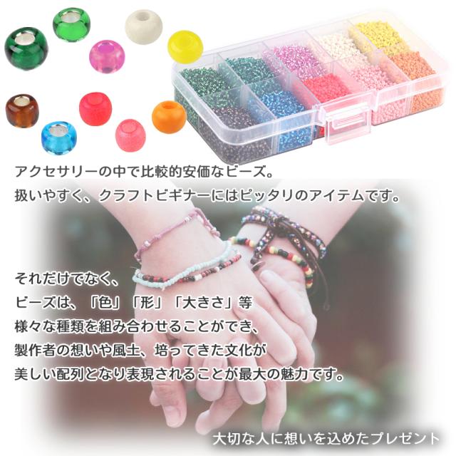 【商品説明】\お家時間に今人気のビーズクラフト♪/可愛いカラー10色がケースに入ったクラフトセットです♪手のひらサイズのケースですので持ち運び便利で保管も簡単!ビーズの魅力は安価なだけでなく、様々な形や大きさ、色を組み合わせ、製作者ならではのデザインに仕上がることです。その土地の風土や文化、製作者の想いが表現され、世界に1つだけのデザイン性が簡単に創作可能。COLORは10色、各色約900個入りです。※グラム換算ですので個数は前後します==========【商品仕様】パッケージ内容:極小ビーズ10色約9000個、専用ケースサイズ(約):全長2mm穴径0.6mm ケース6.5cm×13cm材質:ガラス※食べられません※誤飲の危険があるため、お子様には与えないでください。※小さなお子様の手に届かない場所で使用/保管してください。※衝撃に弱い商品ですので取扱いにご注意ください※モニターにより色合いが若干前後する場合がございます。※輸入品ですので多少の臭いやスレ傷、汚れはご了承ください。※サイズは実寸ですが若干前後する場合がございます。==========※詳細は画像にてご確認ください