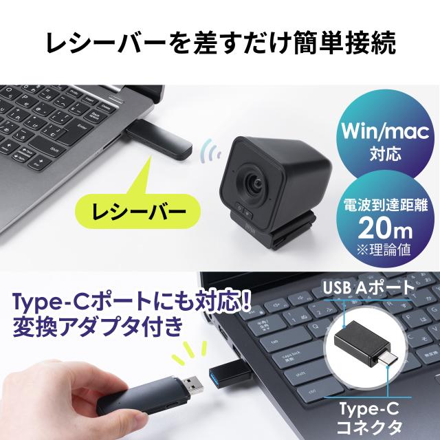 WEBカメラ 無線接続 ワイヤレス 広角レンズ搭載 2.4GHz ドライバー不要 Zoom Microsoft Teams対応 三脚 Type-C対応[400-CAM102]