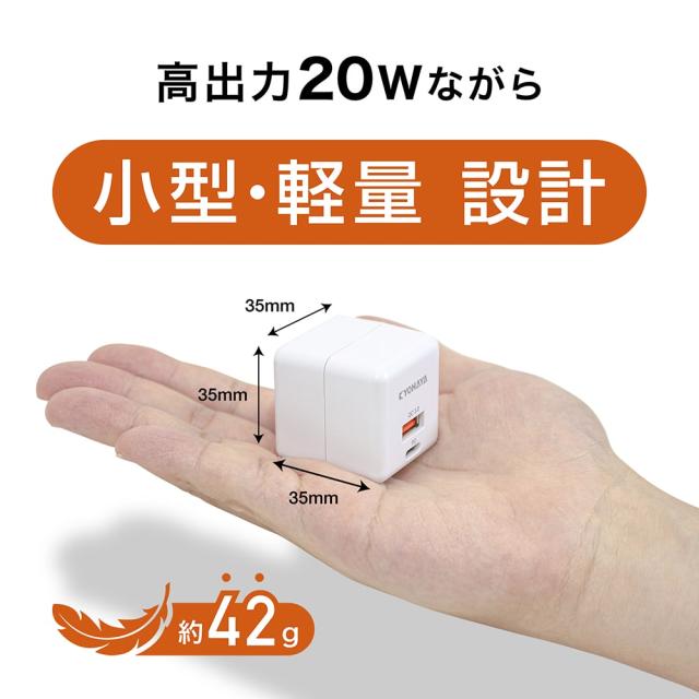 | 高出力の20Wながら1辺がったったの35mmで、重さも約42gと小型・軽量設計のUSB充電器です。 |