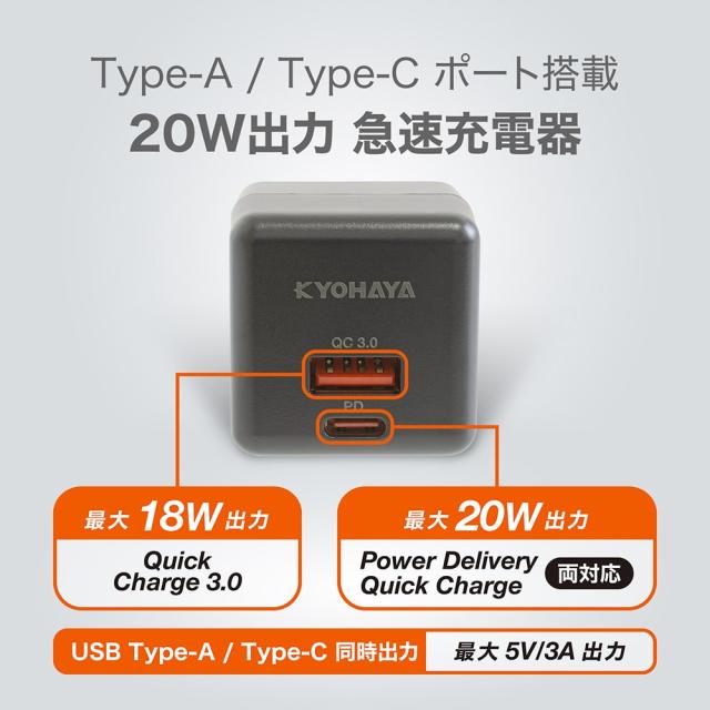 | iPhone 14 / 13 / 12 シリーズを高速充電するのに最適な最大20W出力で、USB CポートとUSB Aポートの2ポート搭載の急速USB充電器です。 |