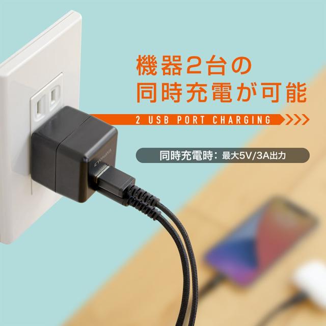| USB CポートとUSB Aポートで2台同時に充電ができます。 ※同時使用時は5V/3Aの出力になり、高速充電にはなりません。 |