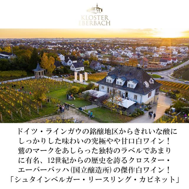 ドイツ・ラインガウの銘醸地区からきれいな酸にしっかりした味わいの究極やや甘口白ワイン!鷲のマークをあしらった独特のラベルであまりに有名、12世紀からの歴史を誇るクロスター・エーバーバッハ(国立醸造所)の傑作白ワイン!「シュタインベルガー・リースリング・カビネット」