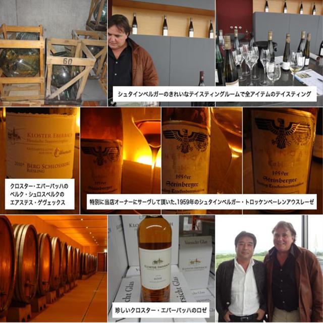 中世からワイン造りが盛んに行われ、17世紀にはワインの生産で維持費を捻出していました。(ヨーロッパの修道院はワインやビールやクッキーの生産で賄った例は多々あります。)カビネットはここのワイン庫から生まれました。プロイセンと対立したこともありましたが、第二次大戦まで庇護下にあり、鷲のマークがその歴史を伝えています。ただし、現在は輸出国への配慮もあり第三帝国とハーケンクロイツを連想させる鷲のマークはソフトな印象のデザインになっています。中世のワイン商では、モーゼルから北西に位置するケルンが大きな市場でした。この一大消費地につながるライン川は諸侯が林立し、その城では通行税を取っていましたが、エーバーバッハは諸侯の墓を作ることで免除されていたといわれています。このように、国や、皇帝や宗教の庇護の下に維持されてきたエーバーバッハのワインには荘厳な雰囲気を湛えています。