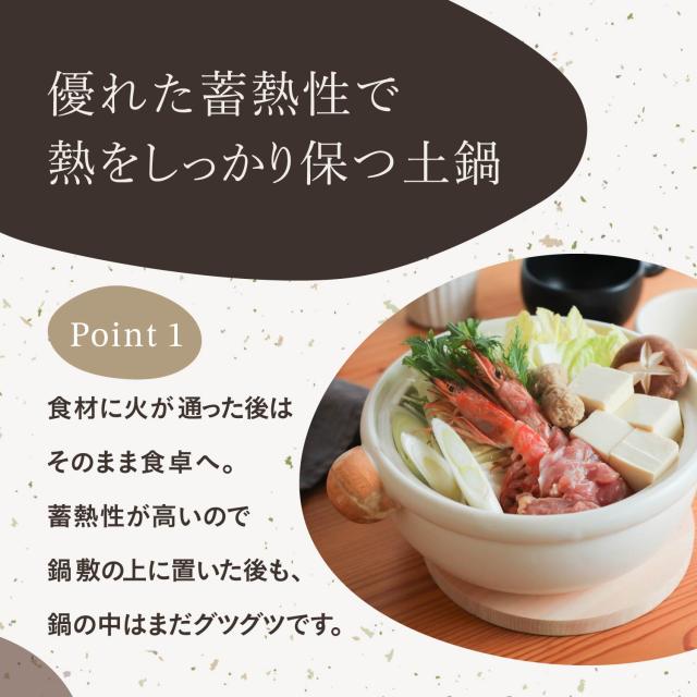 土のぬくもりを感じるたいせい窯のばんこの土鍋小サイズです。食材にゆっくり熱を伝えて、しっかり蓄熱し、耐熱陶器の産地萬古焼がもっとも得意とする、耐熱性に優れた丈夫な土鍋です。食材に火が通ったあとはそのまま食卓へ持っていき、蓄熱性が高いので鍋敷の上に置いたあとも鍋の中はまだグツグツで暖かいまま食べることができます。湯豆腐や鍋焼きうどんなど、鍋料理にちょうどいいサイズです。丸くてぽってりとしたフォルムの持ちやすいコロンとした丸い取手が特徴です。カラーバリエーションはどれもほっこりとするあたたかい風合いのアイテムです。
