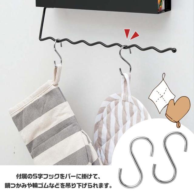 ●S字フック2個付きで輪ゴムや鍋つかみを引っ掛けることもできます。