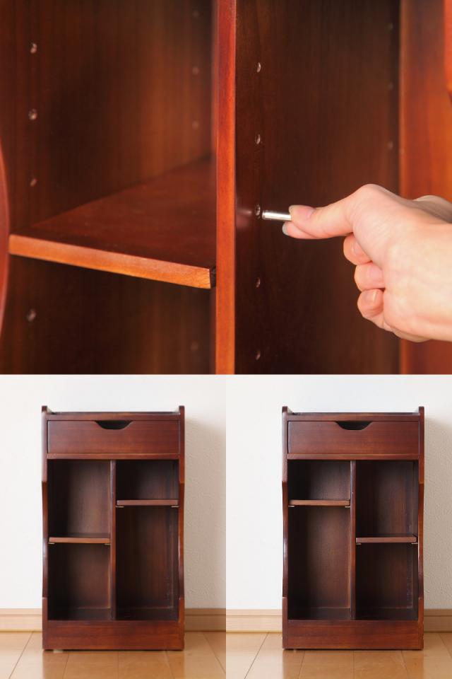 収納する物のサイズによって高さが調節できる棚板が2枚付いています。棚板は7段階で調節可能です。