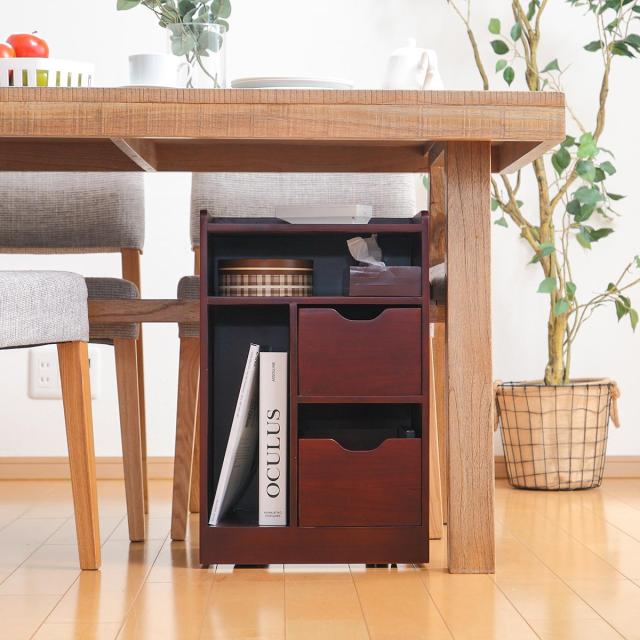 テーブル下の収納スペースとして使用するのに丁度いい、美しい木目調のワゴンです。散らかりがちな雑貨や小物・雑誌などを収納する事ができますので、在宅ワークにもピッタリです。また、シンプルなデザインなのでオフィスでの使用にも最適です。