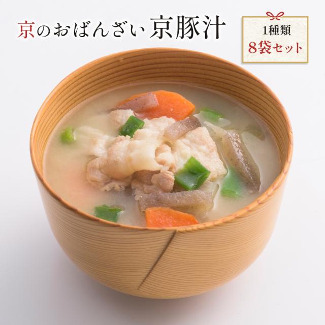 京都府産の豚『京のもち豚』のバラ肉を使用した豚汁の8袋セットです。白味噌をベースに中辛味噌を合わせて食べやすく仕上げました。加熱したお餅を加えればお雑煮風の豚汁がお楽しみいただけます。
