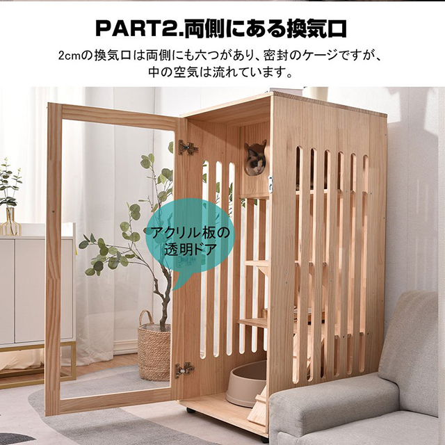 ドアはガラスより高く、より透明性がよく、より耐久性が長いアクリルを選べびます。優れた耐衝撃性があり、もし壊れてしまってもガラスのように破片が飛び散ることがなく、安全性に優れています。猫はケージの中でどんな動きがあっても安全です。