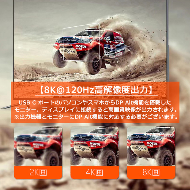 USB C ポートのパソコンやスマホからDP Alt機能を搭載したモニター、ディスプレイに接続すると高画質映像が出力されます。