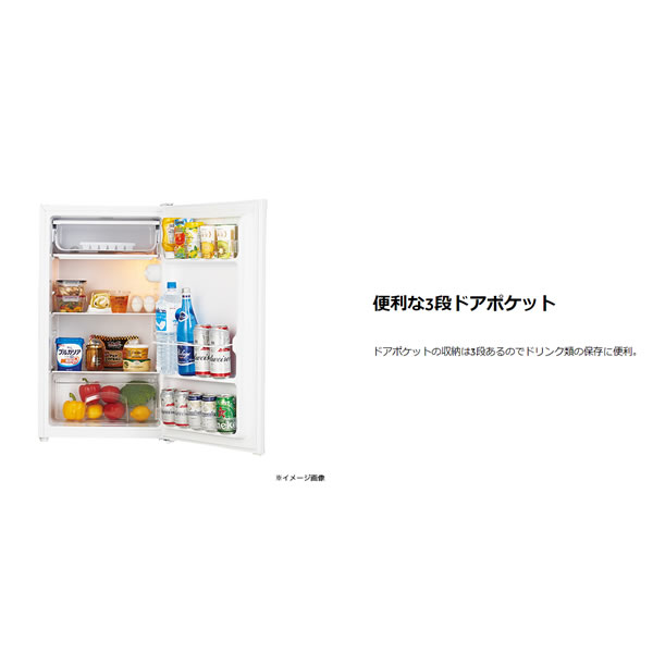 「便利な3段ドアポケット」 ■容量(L) 90 ■ドア数 1 ■冷蔵室容量(L) 90 <68> ※< >内は食品収納スペースの目安 ■電源電圧(V) 単相100(50Hz/60Hz共用) ■定格消費電力(W) 電動機 90/90 ■年間消費電力量(kWh/年) 139 ■外形寸法(mm) 幅475×奥行445×高さ850 ■据付必要奥行寸法(mm) 495 ■質量(kg) 19.5 ■運転音 約23dB ※JIS C9607規定の騒音試験による(安定運転時) ※記載は商品仕様の一部です。仕様説明不足等の理由での返品はできません。特に適合等は必ずご確認ください。