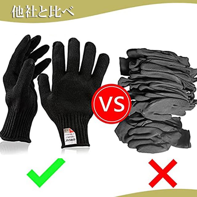 丈夫で密度が高いポリエチレン素材、ワイヤーの特殊な編み方によって強度が強いです。ヨーロッパ耐切創性能が最高のレベル5に満足でき、刃もの、金属、ガラスなどの鋭利ものから手を守ってくれます。