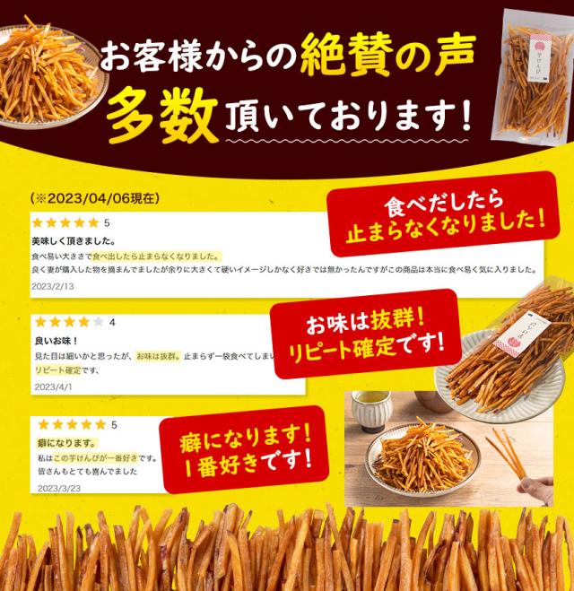 - 細切りの芋けんぴなので芋の味わいがあり、甘すぎず程よい甘さで癖になります。