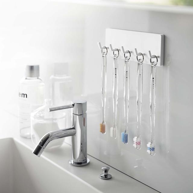 フィルムフックで好きな位置に簡単取り付けのフック5連。歯ブラシ・歯間ブラシ・歯磨き粉チューブを一括収納。