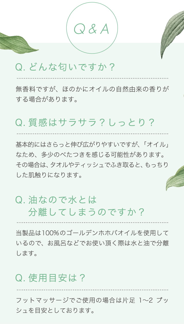 - せっかくポンプ付きですが、後半漏れてきました。 移し替えて使うのでたまにあける時に気付いて、オイルが周りに垂れていて困りました。 漏れるポンプなら無くても良いかと。 ホホバオイルの品質は安定していて素...