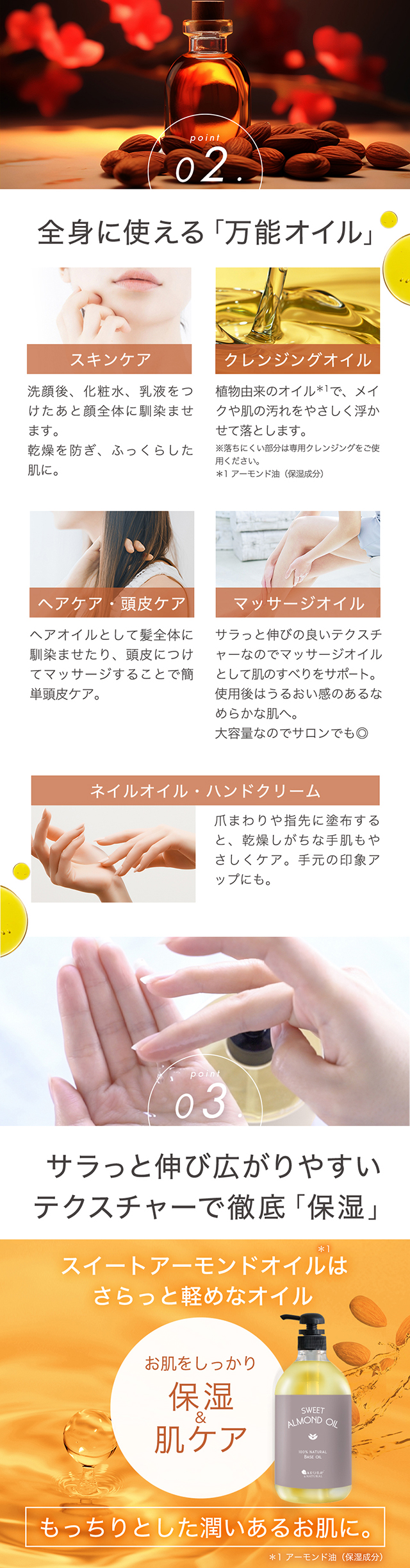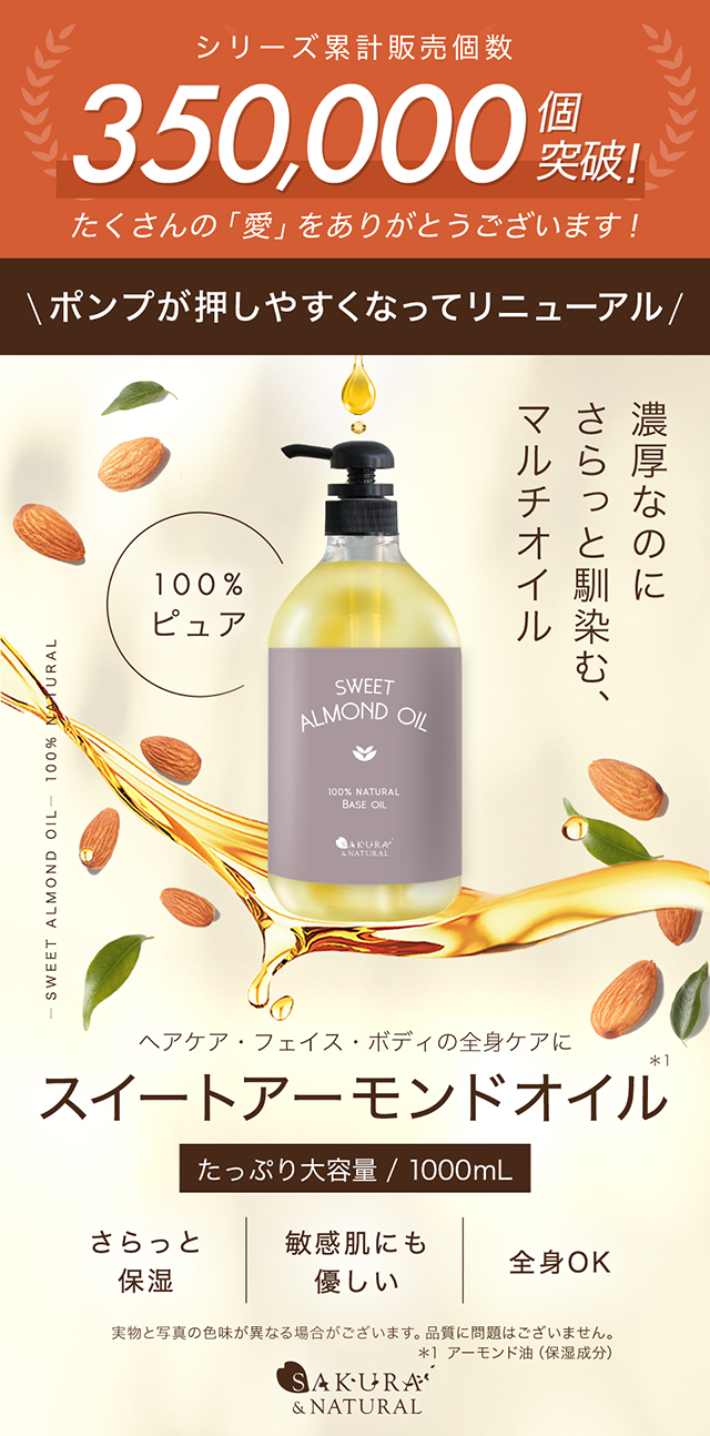 - 肌がカサカサして髪もパサパサするのでアーモンドオイルを購入しました。コスパいいので量は気にせず使えます。わりと延びはいいです。髪につけると少し重めかもしれません。米油がダメなのでアーモンドオイル少し続...