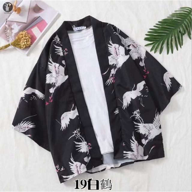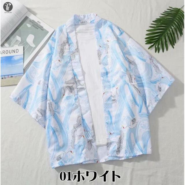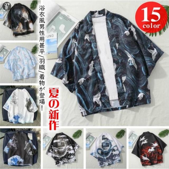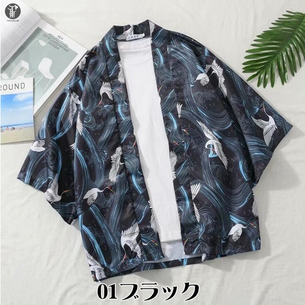 和風 羽織 カーディガン 甚平風 夏服 おしゃれ はおり 着物 はっぴ 鶴柄 七分袖 メンズ 甚平 花火大会 カーディガン 半被 浴衣 夏祭り