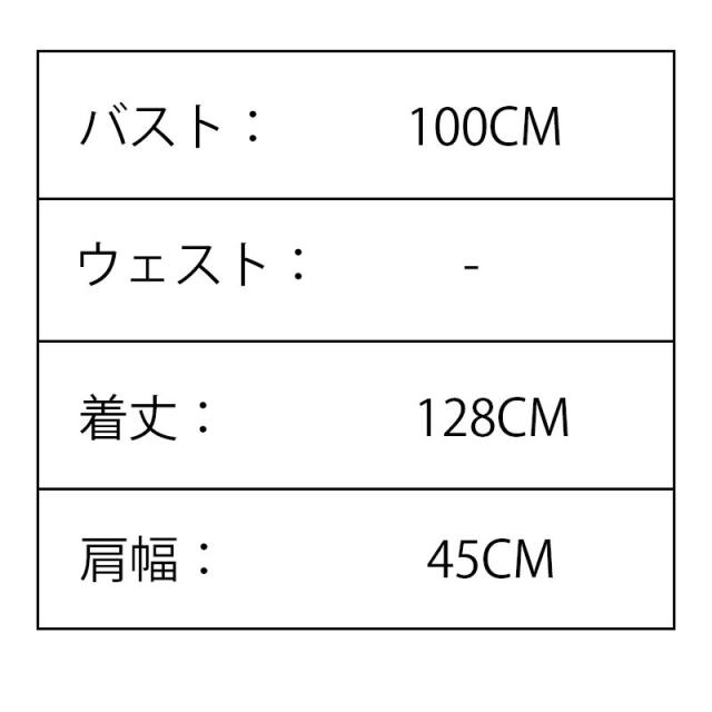 | サイズについての説明 | ★カラー:写真色 ★サイズ:フリーサイズ(単位cm) 【素材】:ポリエステル F:肩幅45バスト100ウエスト- 着丈128 |