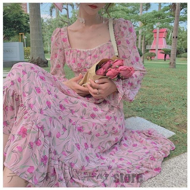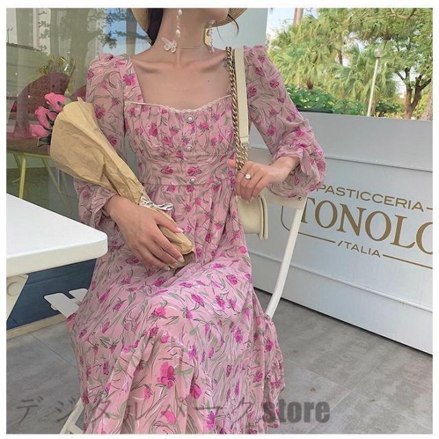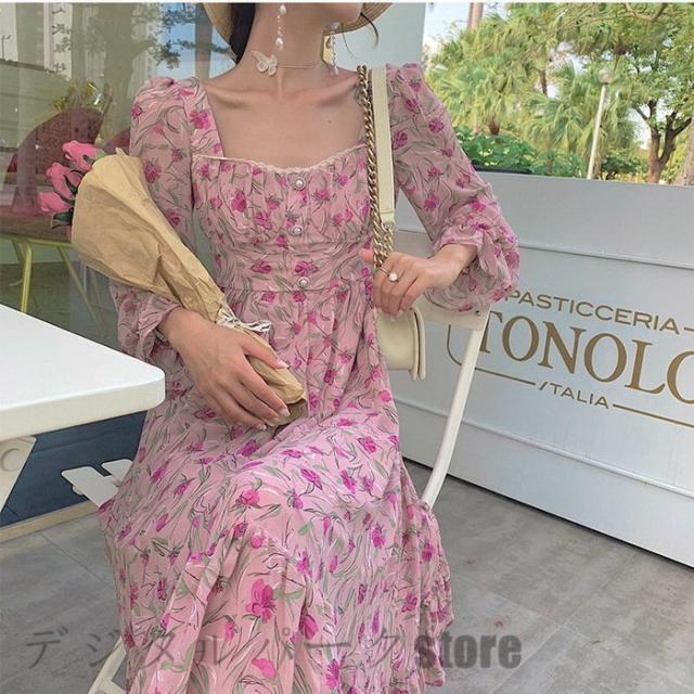 ワンピース 春夏 レディース ワンピース 長袖ワンピース きれいめ 花柄シフォンワンピース パフスリーブ フレアスカート オシャレ 40代マキシワンピース