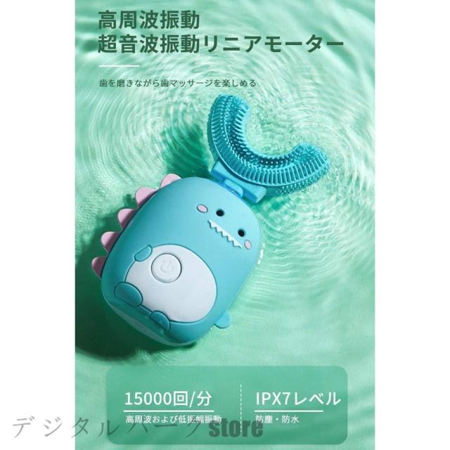 可愛いカートゥーン恐竜模様 U字型子供用電動歯ブラシ 電磁誘導充電 20日持続使用可能 メモリー機能 8000-12000 rpmの振動 可愛いカートゥーン恐竜模様
