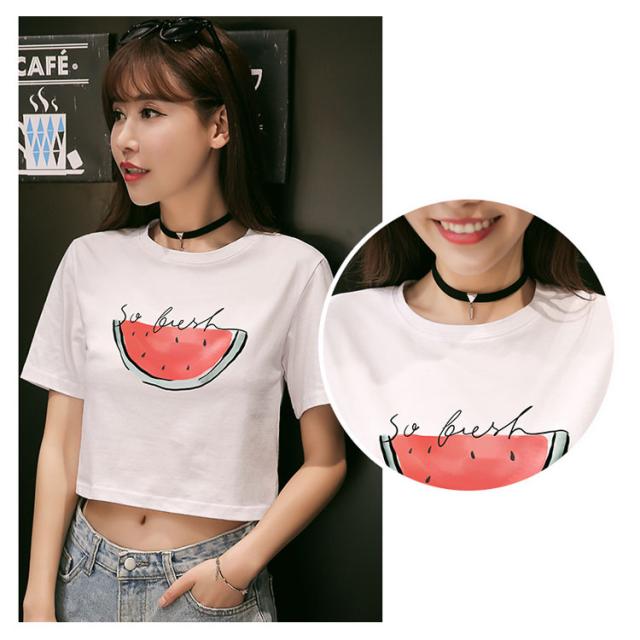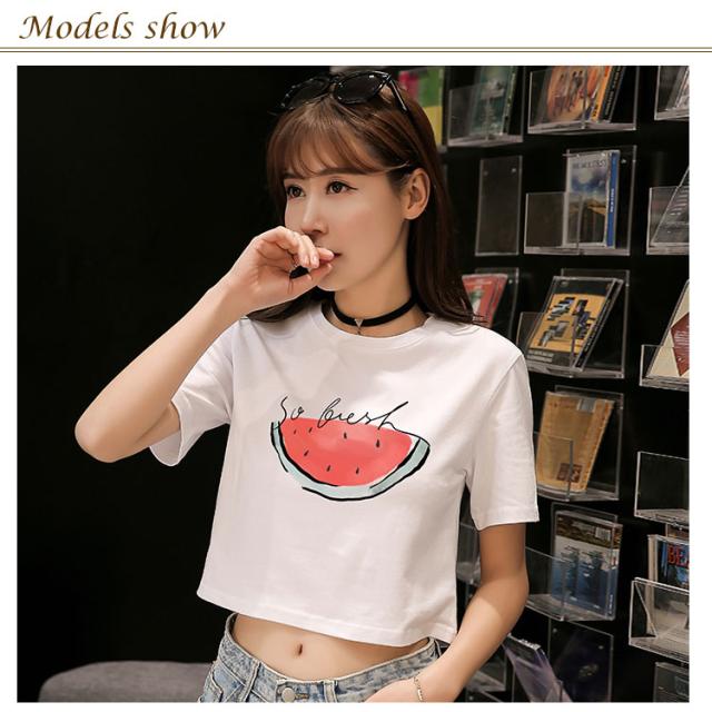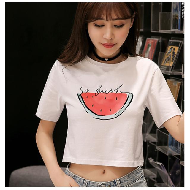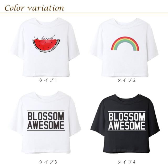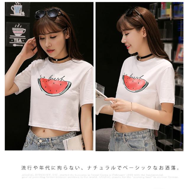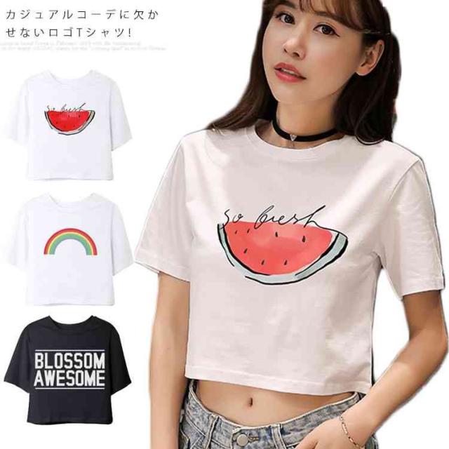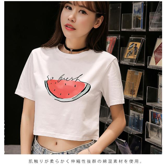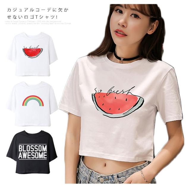 ラウンドネック 半袖 夏服 コットン プリント トップス レディース ショート丈 Tシャツ へそ出し ホワイト シンプル 新作 Tシャツ