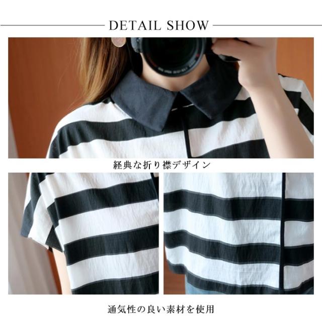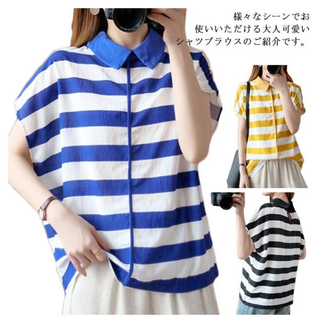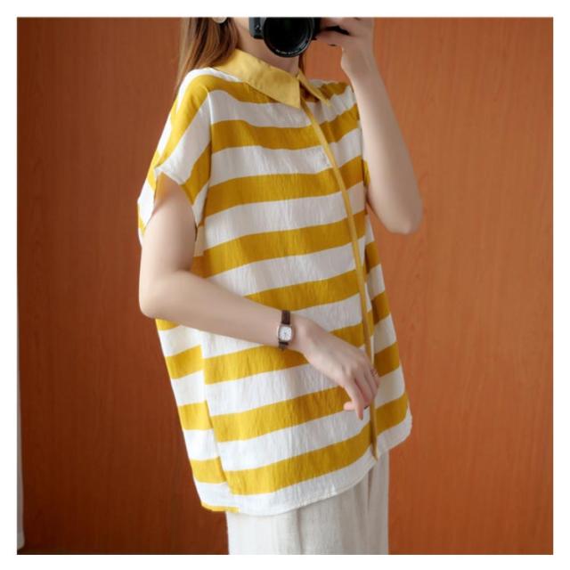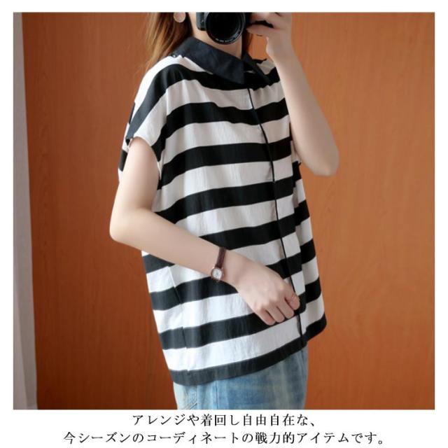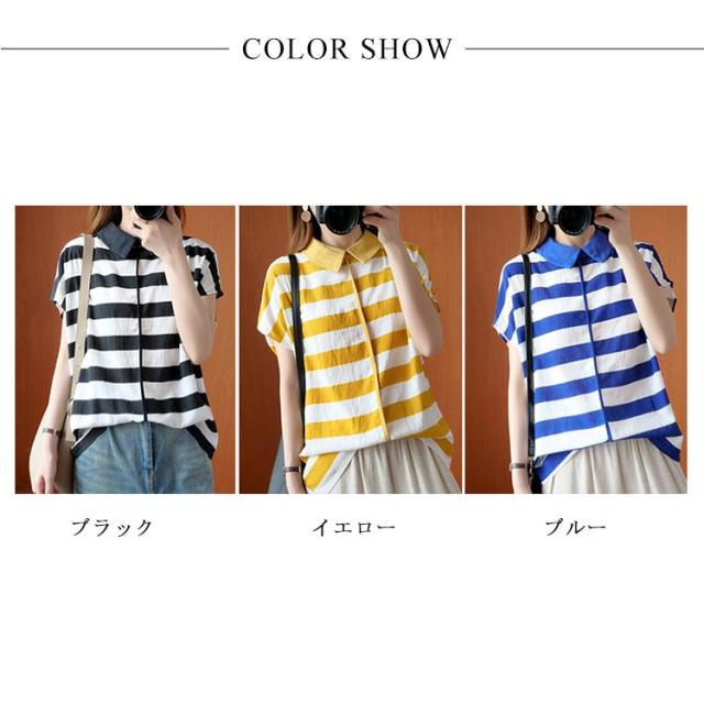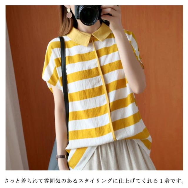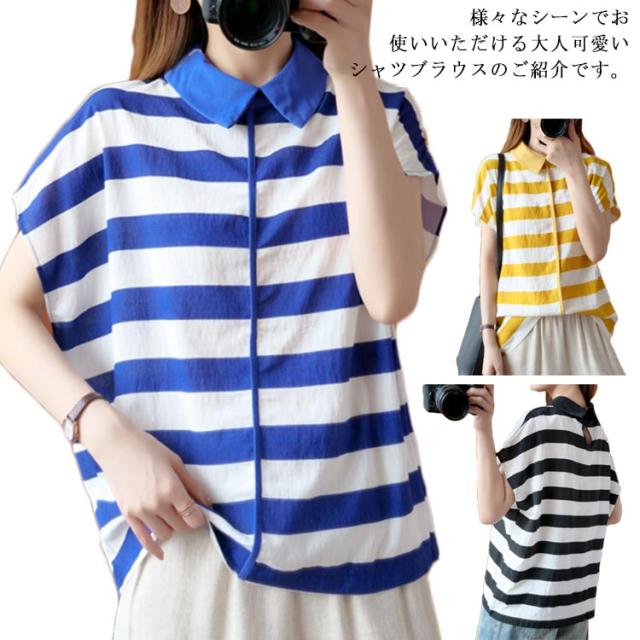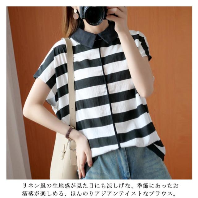 半袖 レディース ブラウス リネンブラウス ボーダー柄 おしゃれ 体型カバー 着痩せ 通気性 リネンブラウス カジュアル