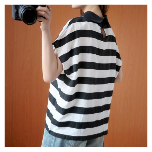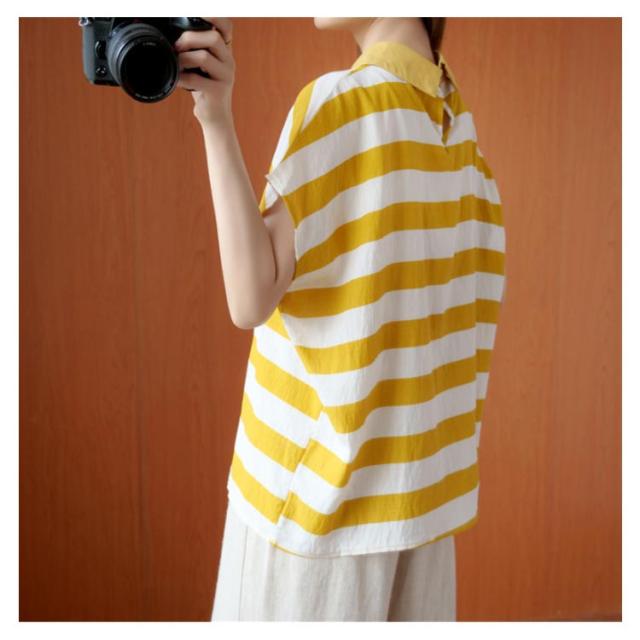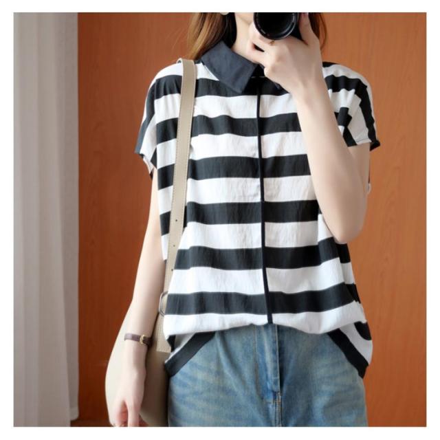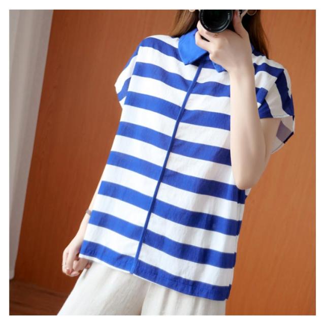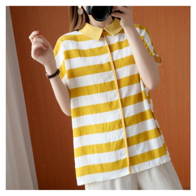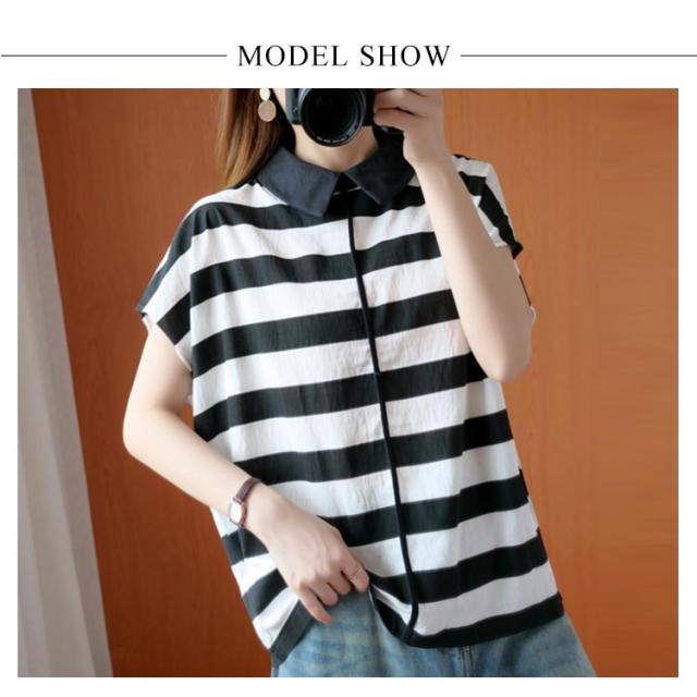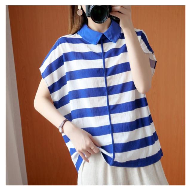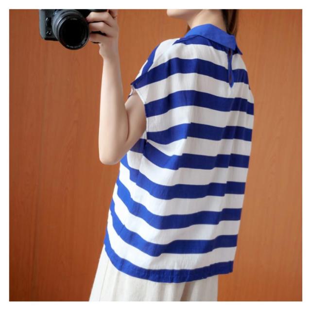 半袖 レディース ブラウス リネンブラウス ボーダー柄 おしゃれ 体型カバー 着痩せ 通気性 リネンブラウス カジュアル
