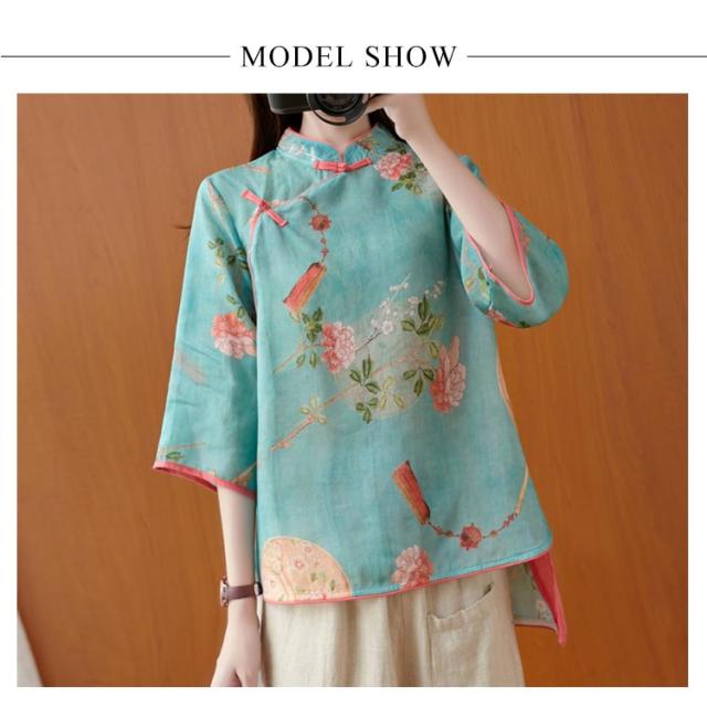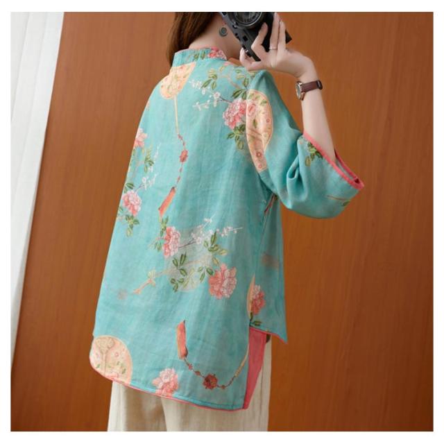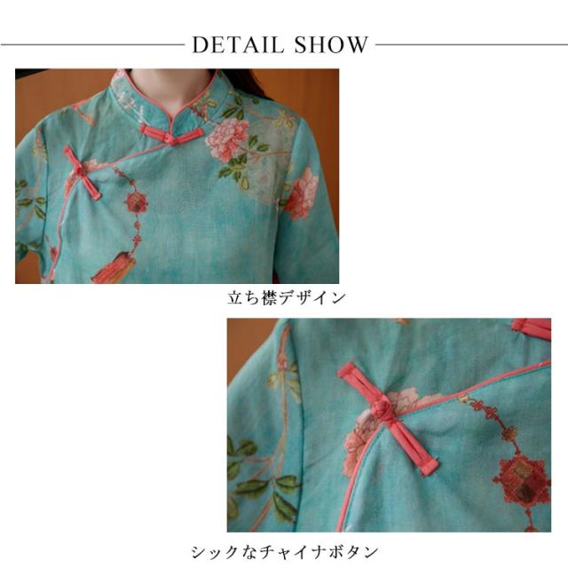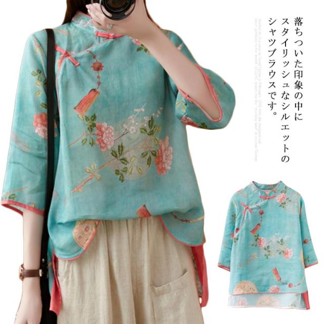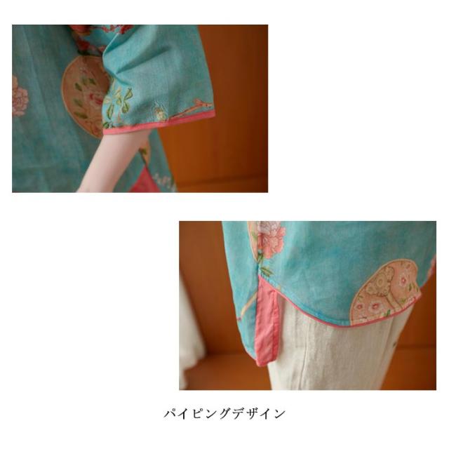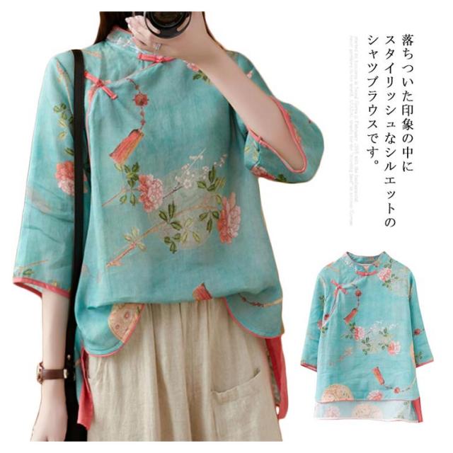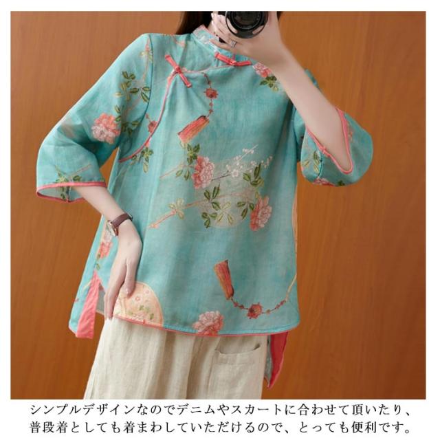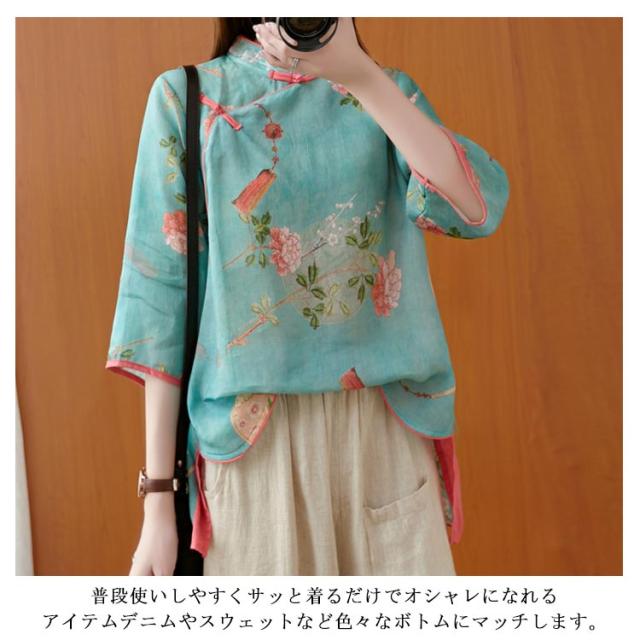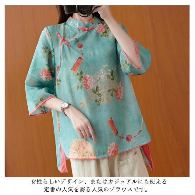 7分袖 民族風 リネントップス チャイナボタン リネンブラウス 立ち襟 カジュアル 文芸 リネンブラウス トップス シンプル 花柄 春夏 Tシャツ ゆったり 復古 エレガント レディース