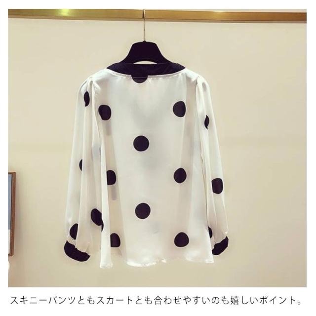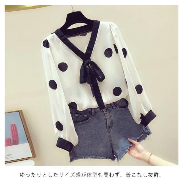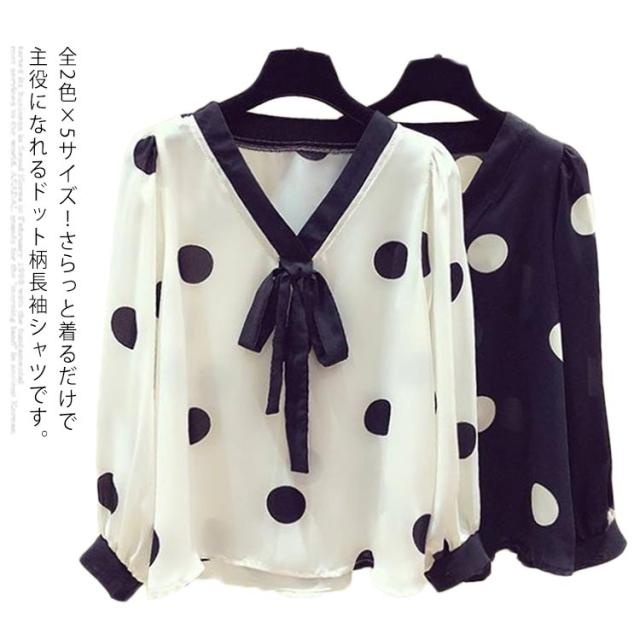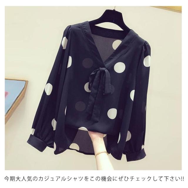 リボン付き シャツ ドット柄シャツ トップス ボウタイシャツ ブラウス 春夏 レディース Vネック 水玉柄 ドット柄 ドット柄シャツ シンプル ボウタイ