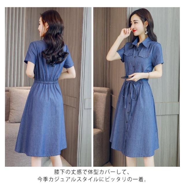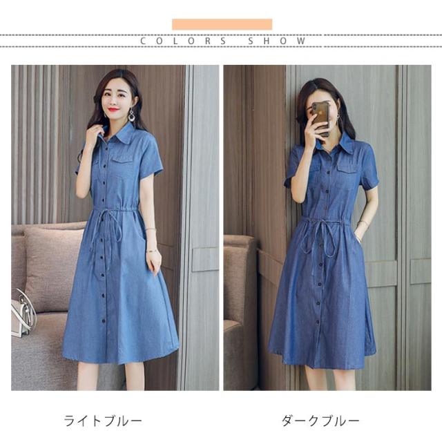 デニムワンピース デニムシャツワンピース 半袖 デニム シャツワンピース 前開き デニムシャツワンピース 膝下丈 襟付き ウエスト紐 aライン ワンピース