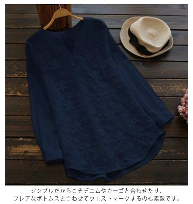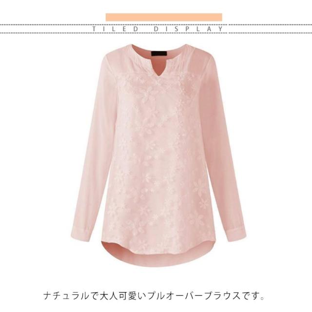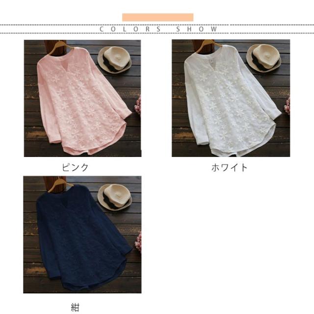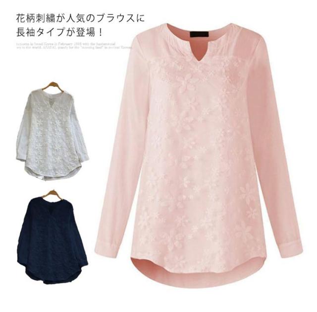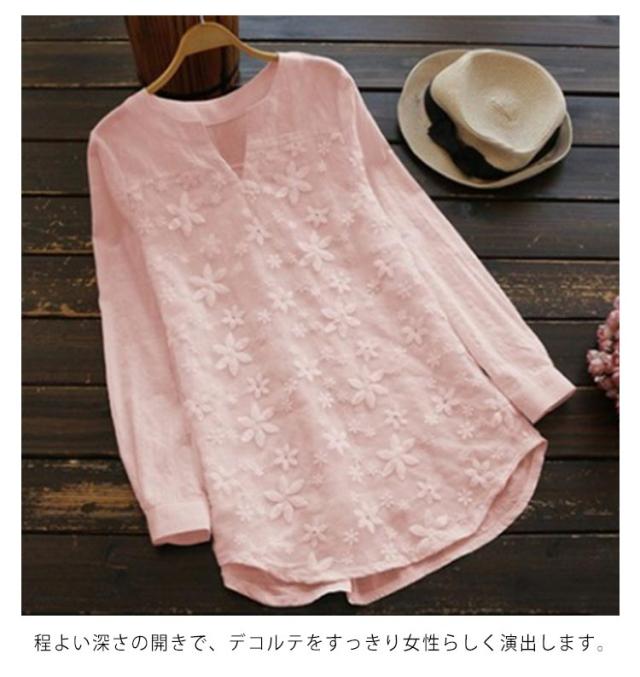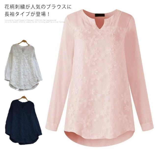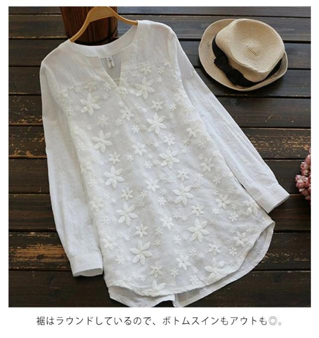 レース プルオーバーブラウス 花柄刺繍 母の日 レディース 春 刺繍ブラウス 花柄 大きいサイズ チュニック キーネック トップス シャツ カジュアル 切り替え 花柄刺繍 夏 綿麻 長袖