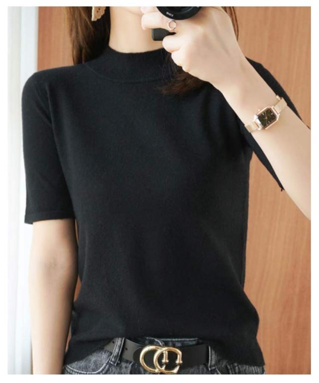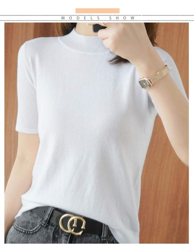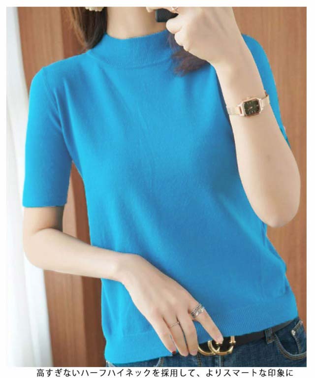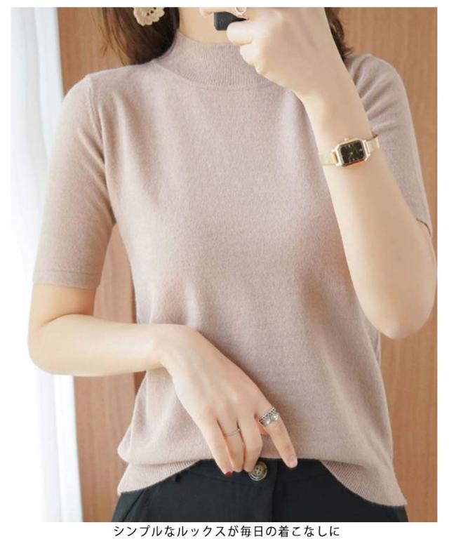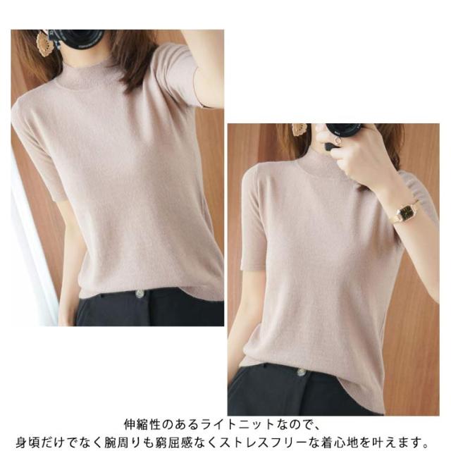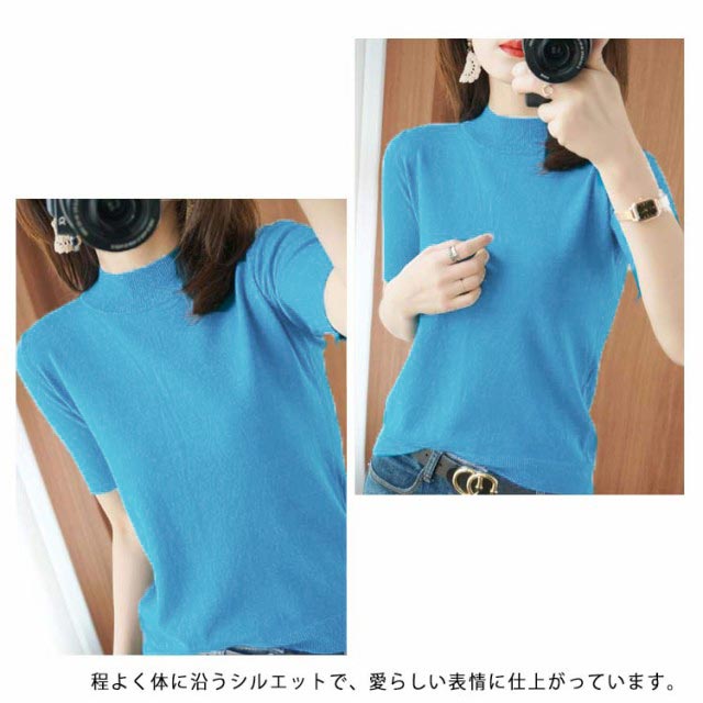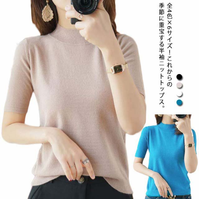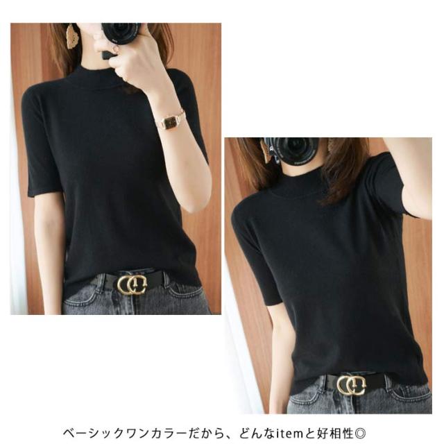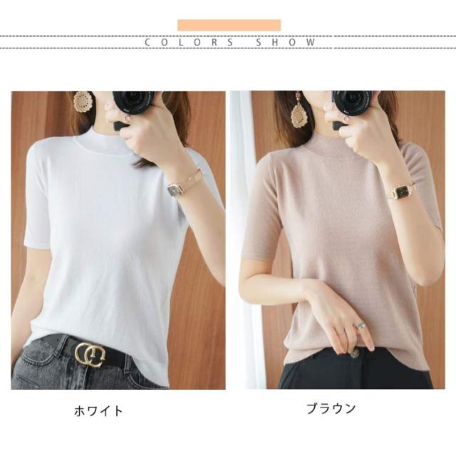 ニットソー レディース tシャツ コンパクト 半袖ニット サマー ハイネックニット 半袖tシャツ 無地ニット 薄手 サマーニット 全4色×6サイズ!ニット シンプル 全4色×6サイズ!ニット