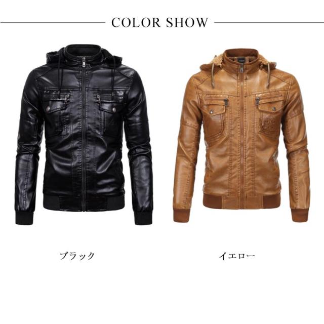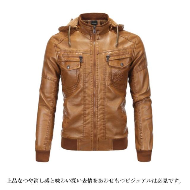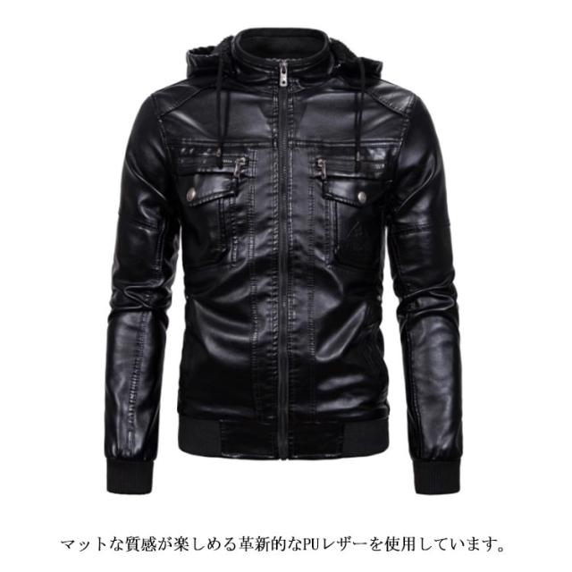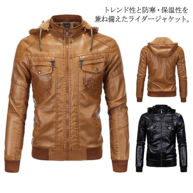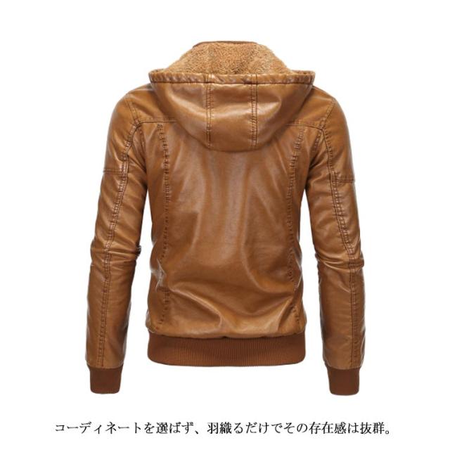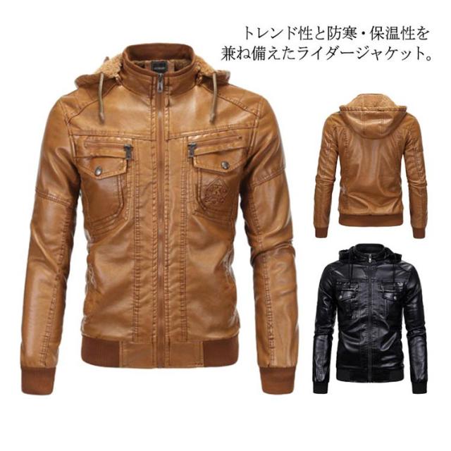 アウター メンズ ライダースジャケット ライダースジャケット 冬服 裏起毛 ブルゾン フード付き ジャケット 革ジャン 秋冬 着痩せ お洒落 レザージャケット