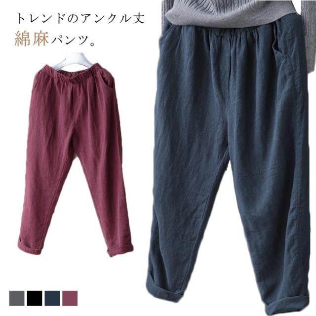リネンパンツ 送料無料 アンクルパンツ リネンパンツ 9分丈 サルエルパンツ ウェストゴム レディース 綿麻 パンツ テーパードパンツ 夏服 2020 イージーパンツ