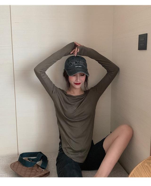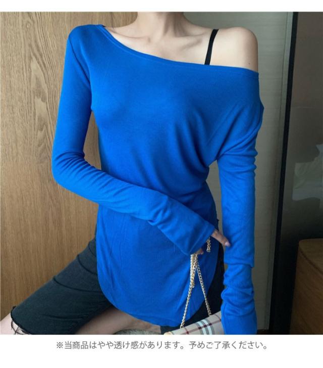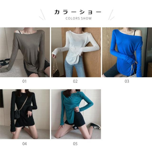 レディース オフショルダー Tシャツ 長袖 オフショルダー 伸縮性 タイトTシャツ ロングTシャツ ストレッチ ラウンドネック トップス 薄手