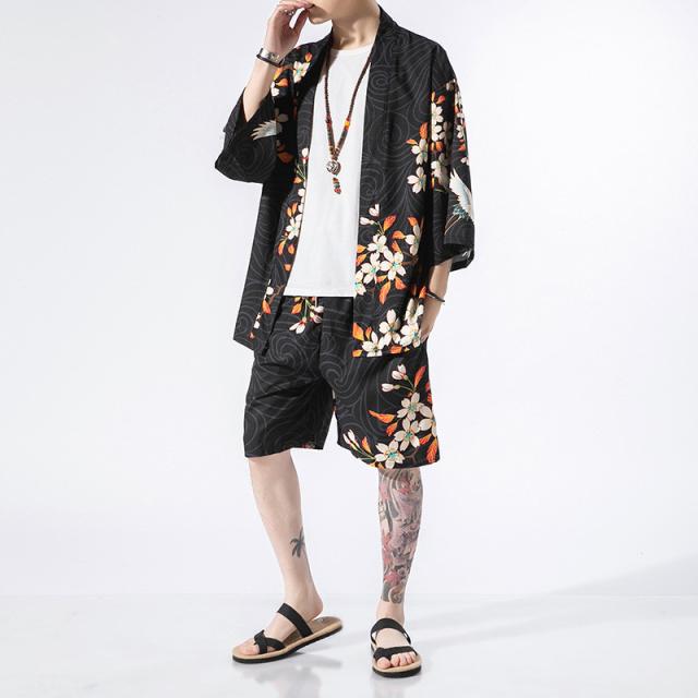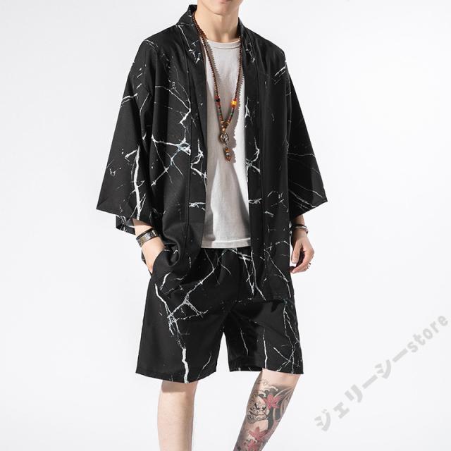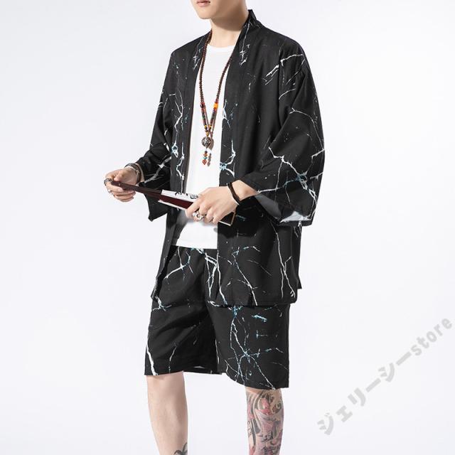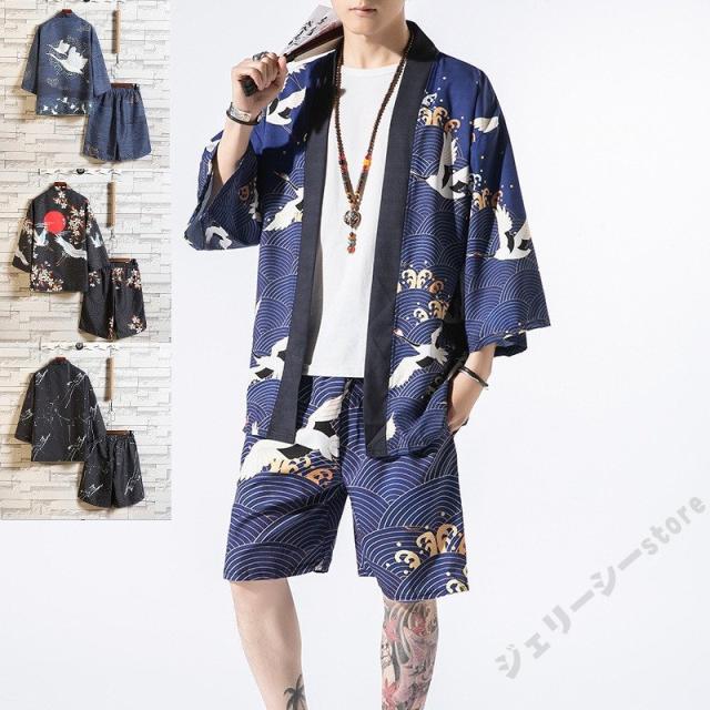 メンズセットアップ メンズセットアップ 上下セット リネン 羽織 鶴柄 五分袖 カジュアル 甚平風 部屋着 夏物 ルームウエア シャツ