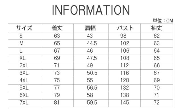 | サイズについての説明 | サイズ:S/M/L/XL/2XL/3XL/4XL/5XL/6XL/7XL |