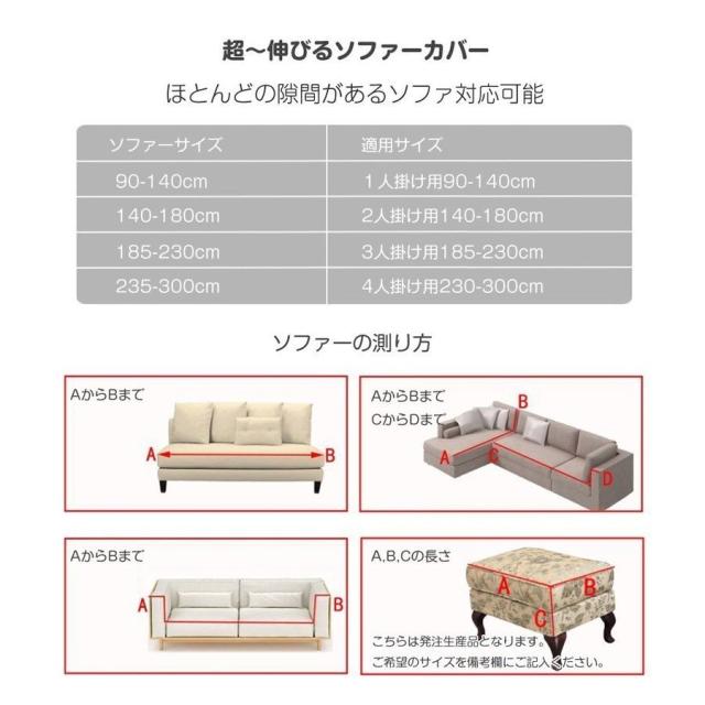 | サイズについての説明 | サイズ: 1人掛け:90-140cm 2人掛け:145-185cm 3人掛け:190-230cm 4人掛け:235-300cm |