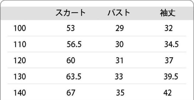 | サイズについての説明 | 【サイズ】 100 スカート53 バスト29 袖丈32 110 スカート56.5 バスト30 袖丈34.5 120 スカート60 バスト31 袖丈37 130 スカート63.5 バスト33 袖丈39.5 140 スカート67 バスト35 袖丈42 |