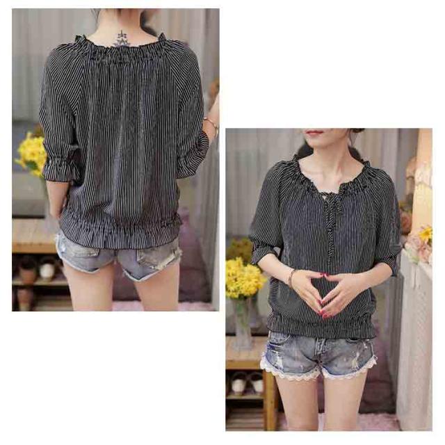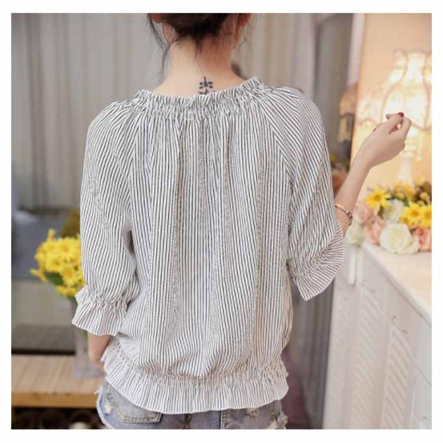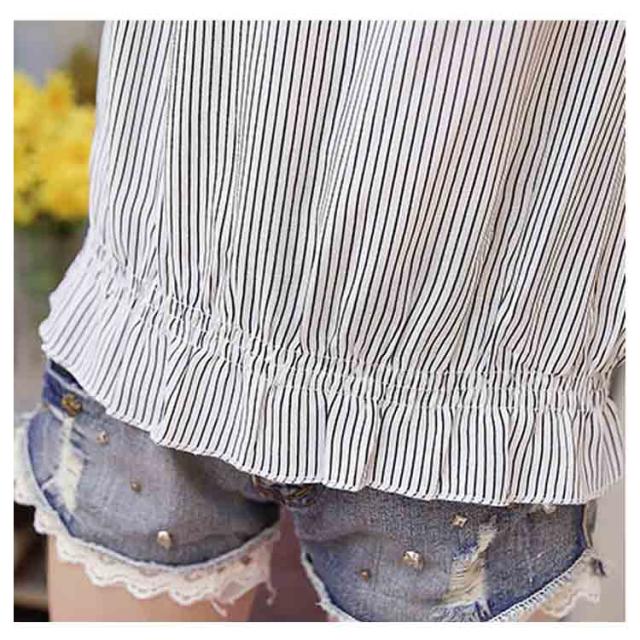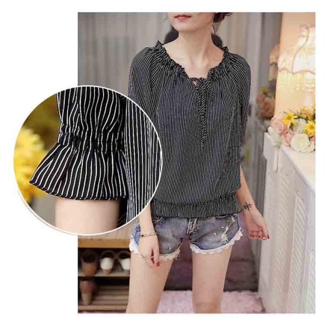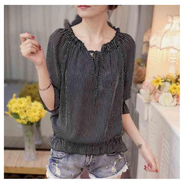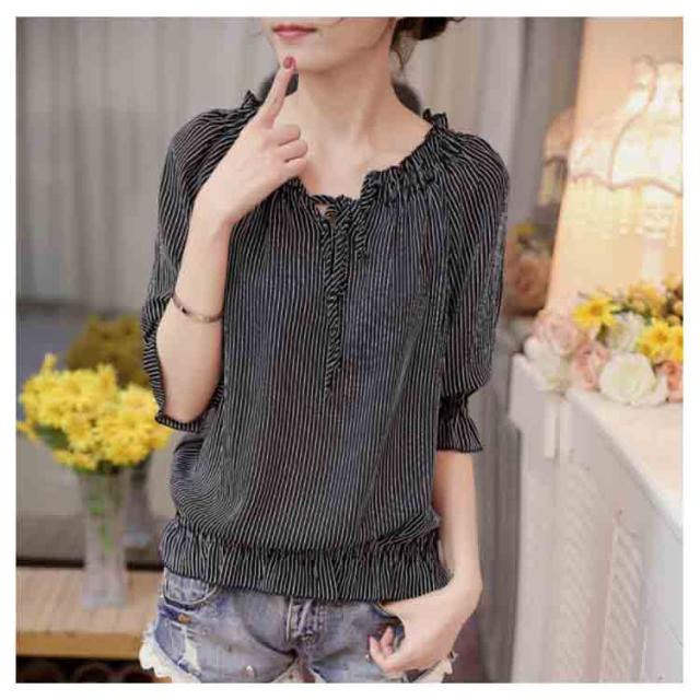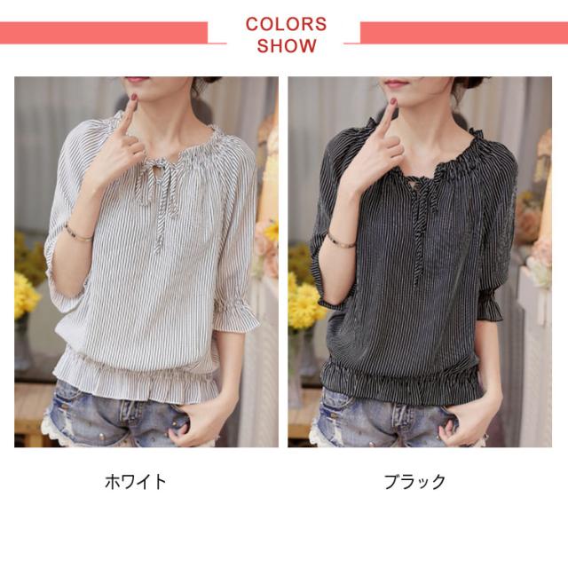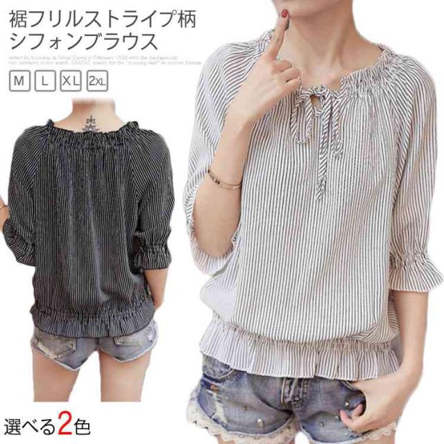 シフォンブラウス シャツ シフォンブラウス シフォン ブラウス フリル ペプラム風 半袖 ストライプ柄