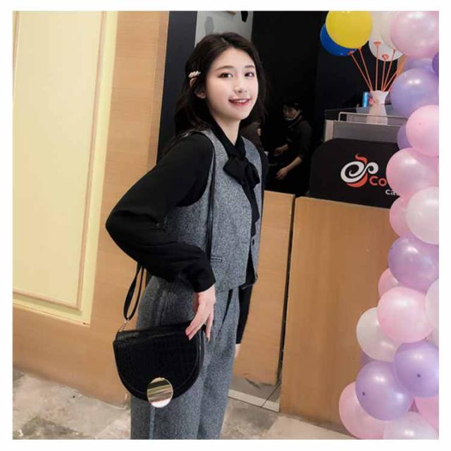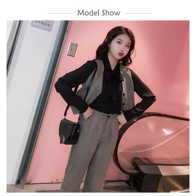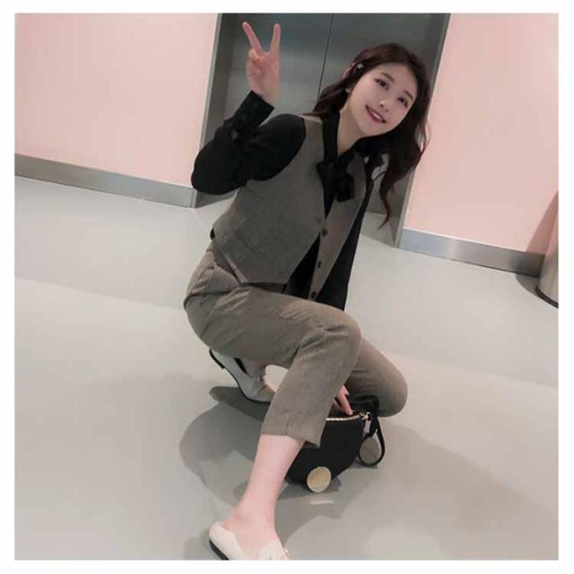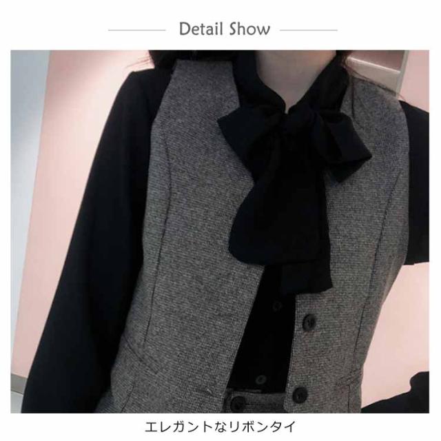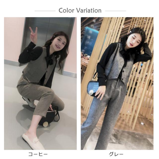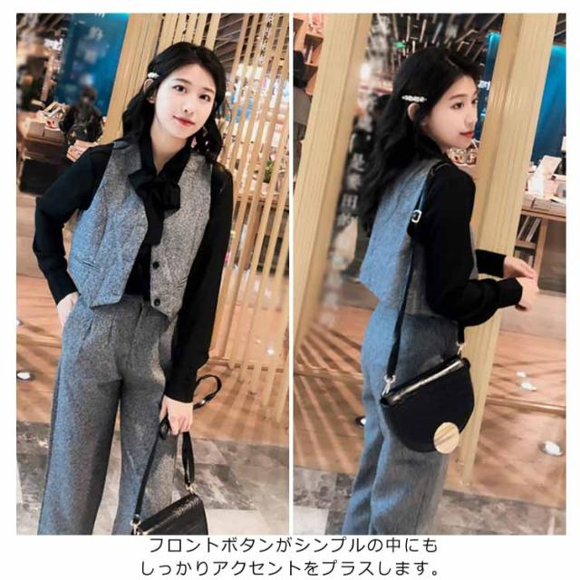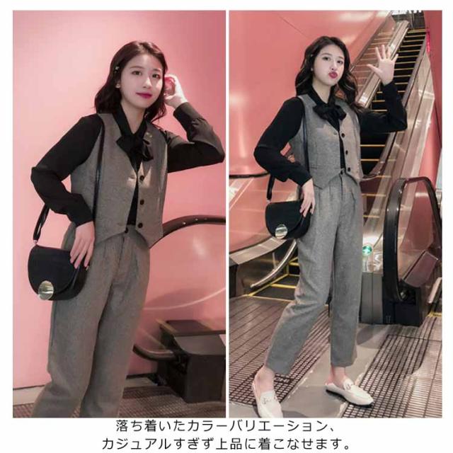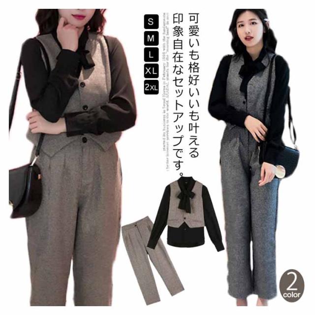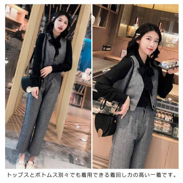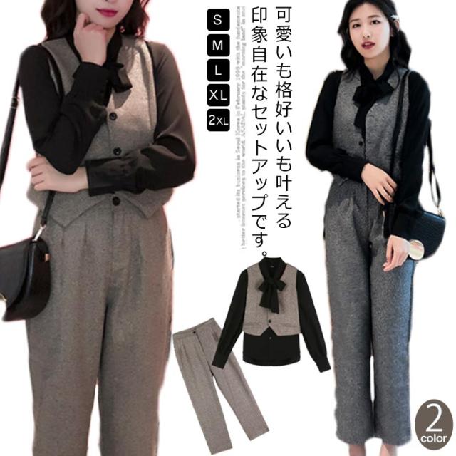 デーパートパンツ レディース 春 ベスト ブラウス 上下セット セットアップ 大人可愛い リボン 3点セット セットアップ
