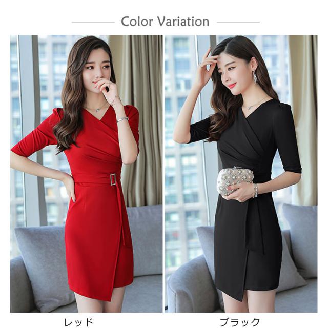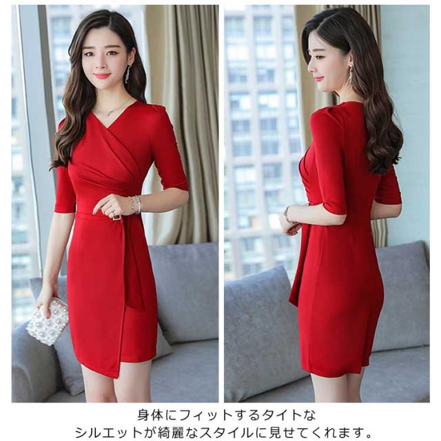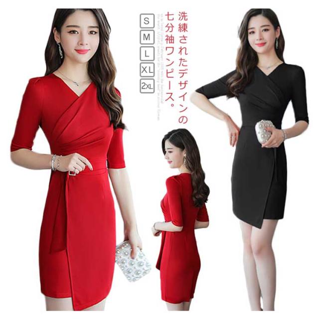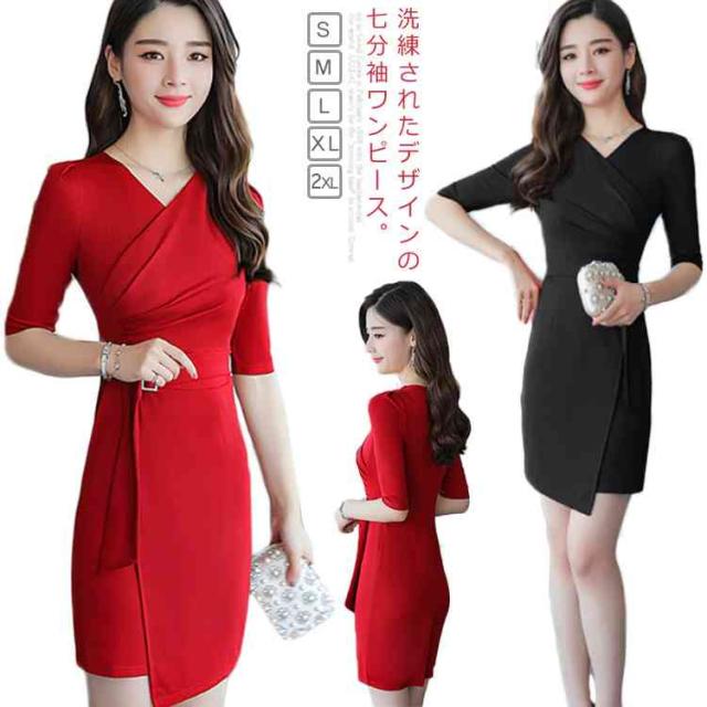 オフィス レディース ワンピース タイトワンピース パーティドレス 着痩せ Vネック OL フォーマル 通勤 膝丈 大きいサイズ 上品 ワンピース 同窓会 七分袖