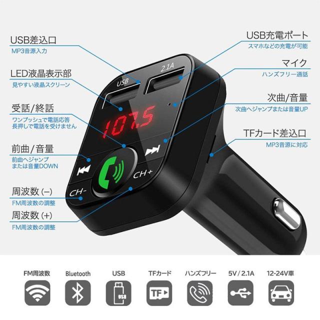 ハンズフリー通話 FMトランスミッター Bluetooth iPhone USB急速充電 TF LED ブルートゥース MP3プレーヤー MicroSD FMトランスミッター Android
