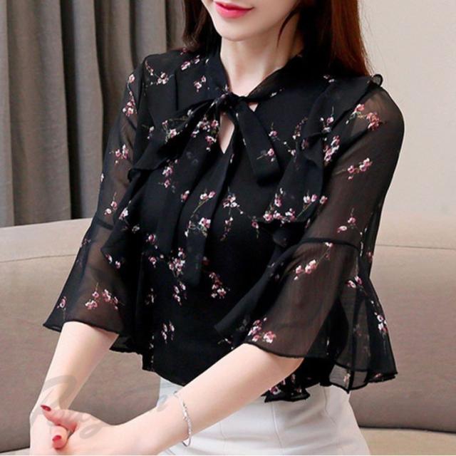 ブラウス レディース 韓国風 半袖ブラウス 花柄トップス 春夏 フリル 〓 リボン おしゃれ 大きいサイズ シフォンブラウス 大人 通勤 ブラウス