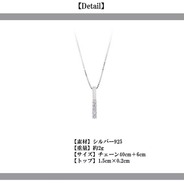 | サイズについての説明 | シルバー925素材の華奢ネックレス。 トップはストレートバーにジルコニアが埋め込まれたプレートネックレス。 約1.5cmに2mm幅のミニトップはジルコニアの輝きがさりげない存在感。 チェーンも1mmも無いサイズにスネークチェーンの様なデザインは光の加減で煌びやかに輝きます。 約40cmの長さは首から鎖骨周りを美しく魅せ、約6cmのアジャスターはお好みの 長さに調節可能。アジャスターエンドにはシルバー925の刻印も刻まれています。 華奢なネックレスにシルバー素材でアレルギーも少なく安心です。 チェーン:約40cm+6cm |