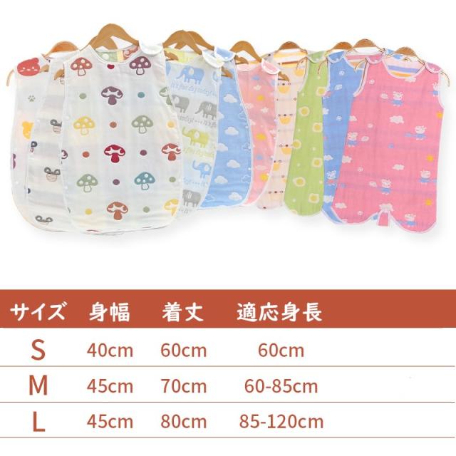 | サイズについての説明 | ハンスパンプキン夏用クールスリーパー 2WAYオール型 0歳,1歳,2歳,3歳,4歳,5歳 適応 お子様の安眠を一番に考えデザインされた機能性素材を使用したハイクオリティースリーパー ■サイズ(+-2cm程の誤差あり) S:身幅40cm 着丈60cm 適応身長60cm M:身幅45cm 着丈70cm 適応身長60~85cm L:身幅45cm 着丈80cm 適応身長85~120cm ■ 夏は涼しく、冬は暖かい パジャマと布団の良いところをかけ合わせた新しい寝間着です 綿100%の柔らかい6重ガーゼ構造なので通気性と保温性に優れています スナップボタン式でガバッと開けるので寝ている状態でも着脱できます おもらし対策 寝冷え対策に 柄により、左右開き、ボタン数など、細部デザインは異なります |