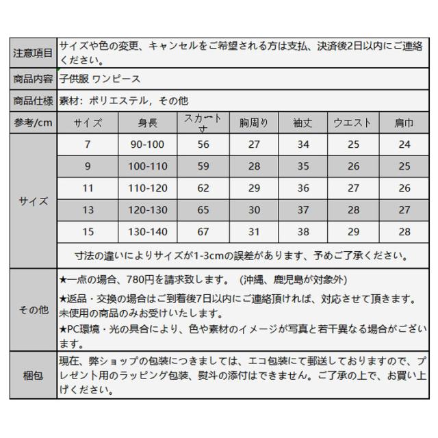 | サイズについての説明 | 子どもドレス 赤ちゃん 長袖 チュールスカート 黒ワンピ 子供ワンピース ニット キッズ 長袖 韓国子供服 春秋 女の子 ベビードレス 可愛い 子どもドレス 赤ちゃん 黒ワンピ 卒園式 ふわふわ 結婚式 発表会 商品内容:子供服 ワンピース 参考サイズ:(単位:cm) 7 90-100cm 9 100-110cm 11 110-120cm 13 120-130cm 15 130-140cm 注意事項: ★通常送料は1点780円(沖縄は1点につき1200円)、1点以上購入した場合1点ずつ200円を追加いたします。 |