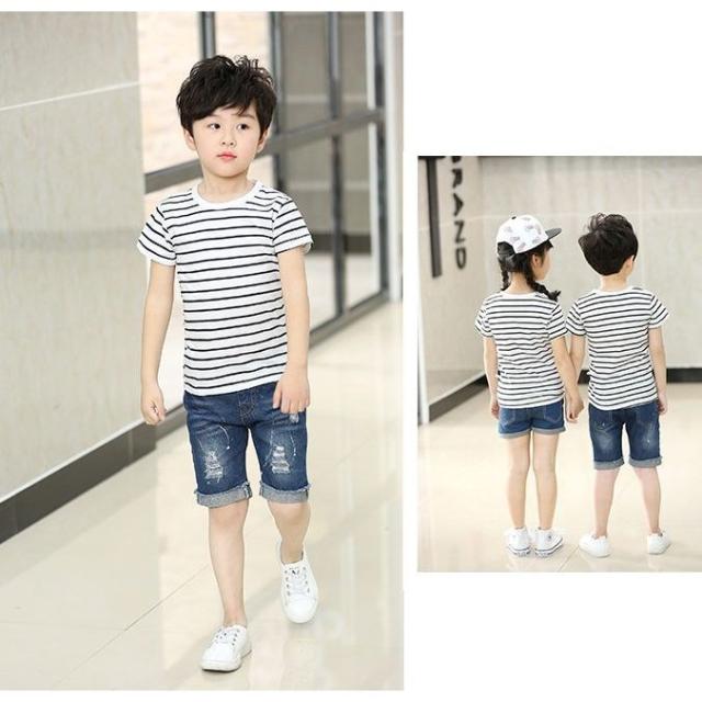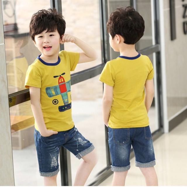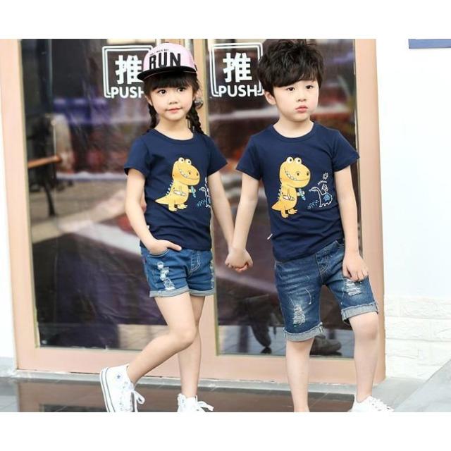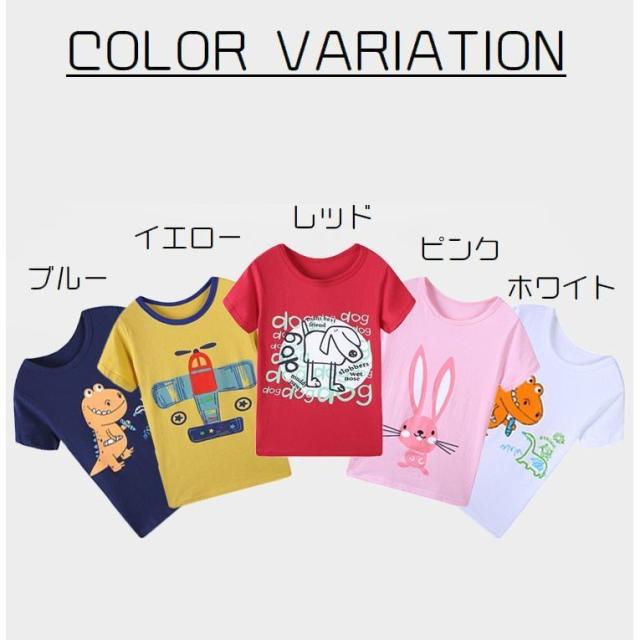 Tシャツ 女の子 男の子 ラウンドネック ジュニア Tシャツ トップス キッズ 半袖 イラストプリント ボーダー柄 恐竜 飛行機 イヌ 犬 子ども服