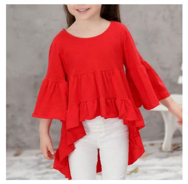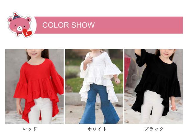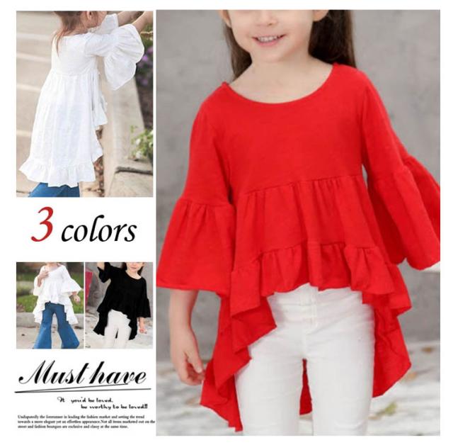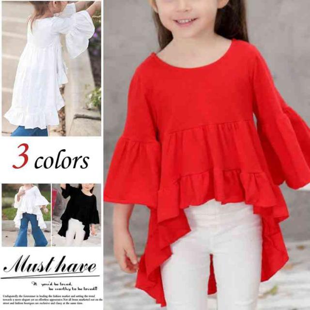 送料無料 カットソー トップス こども 女の子 子供服 シャツ コットン フリル 無地 キッズ パフスリーブ 後ろ下がり 七分袖 新作 送料無料